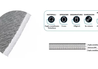 - Strato termico interno: polietilene alluminizzato, spessore 5 mm, che offre una protezione termica superiore e un effetto barriera contro l’umidità. Questo strato assicura che i vostri prodotti rimangano alla giusta temperatura, anche durante trasporti prolungati.