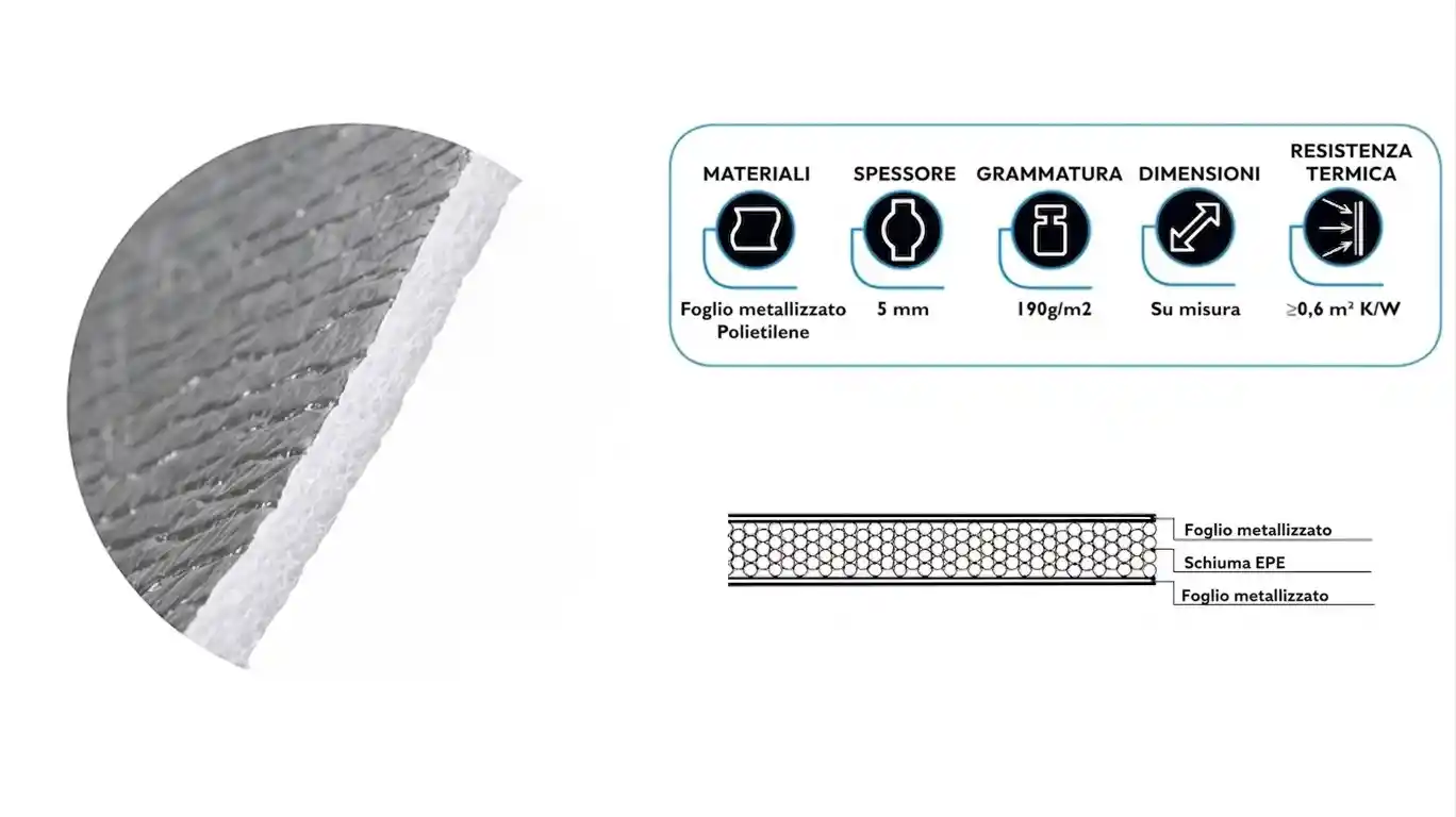 - Isolamento termico ottimale: la nostra copertura è realizzata con uno strato termico in schiuma di polietilene alluminato, dello spessore di 5 mm, che garantisce un eccellente isolamento dalle temperature calde o fredde.